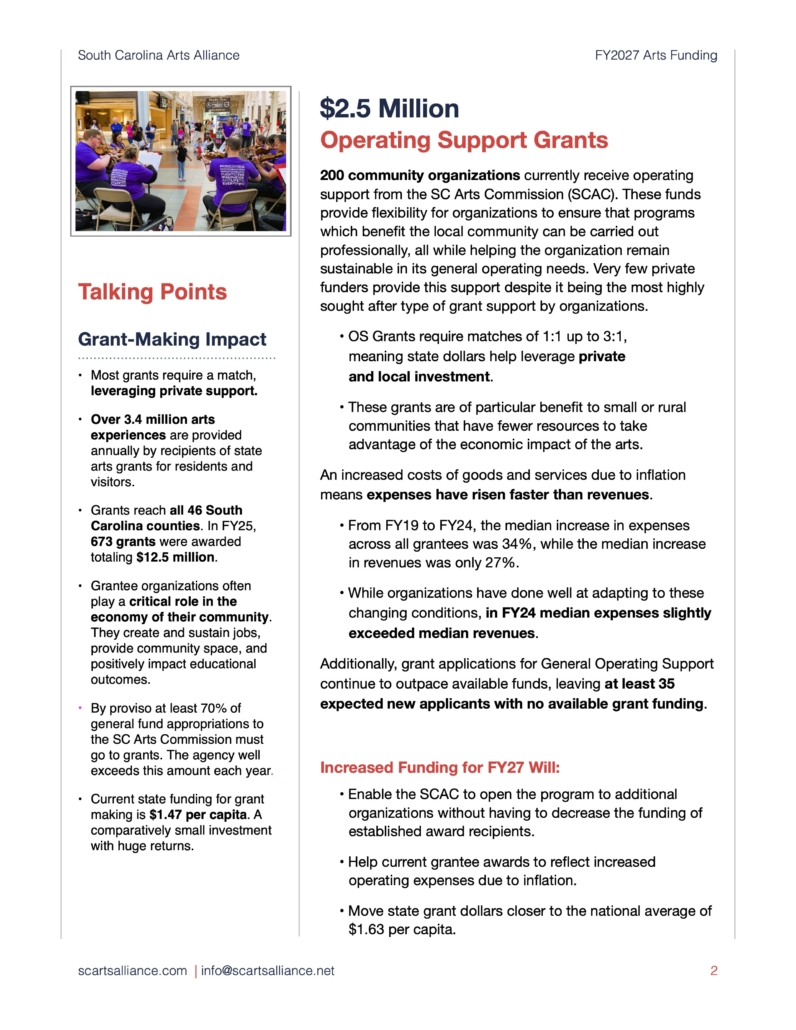 This past week, our partners at the SC Arts Alliance led vital efforts to advocate for the arts across our state. Their work ensures continued support for arts funding, education, and community programs. Check out the latest advocacy briefs below. These briefs outline priorities for the 2026-27 fiscal year.