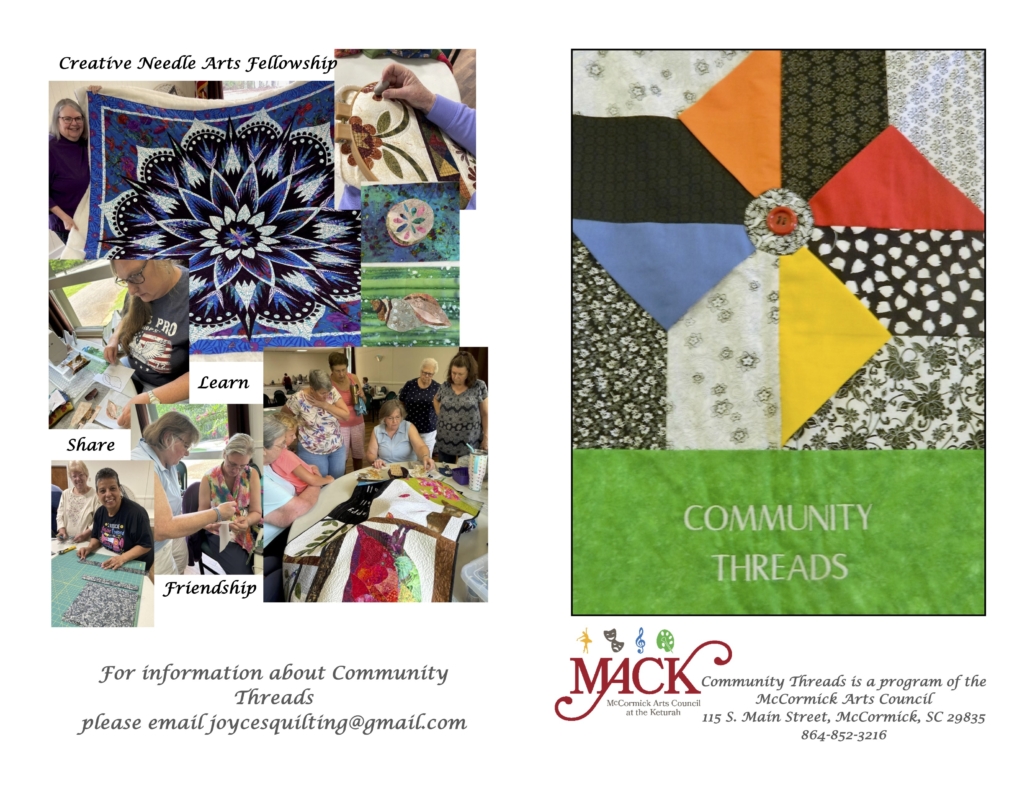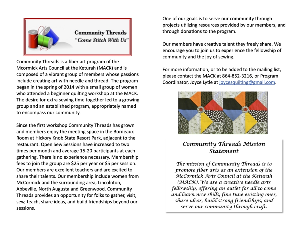 For more information, or to be added to the mailing list, please our Community Threads Program Coordinator, Joyce Lytle at joycesquilting@gmail.com.